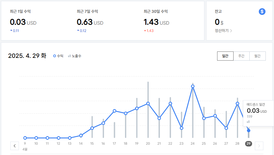 - 하루 수익이 0원일 경우, 무효 클릭 감지 후 수익 차감일 수도 있습니다.
